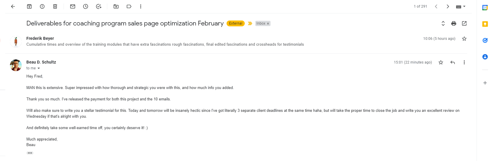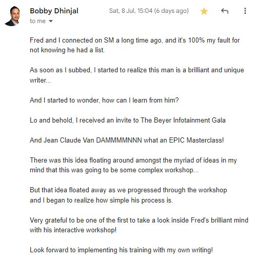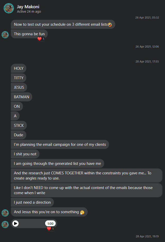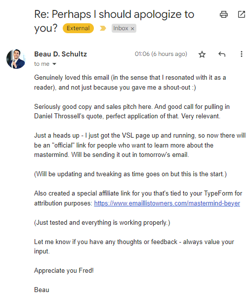 He and I collaborated on a 400,000+ subscriber email list where Thomas Lalas and I spent 3 months breaking sales records non-stop. He later referred me to a new prospect and had this to say: